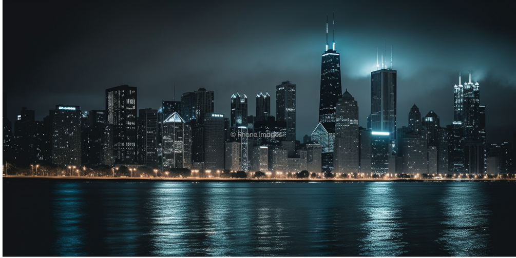 Under the twinkling night sky, the magnificent Chicago skyline emerges, showcasing the towering illuminated buildings, while the serene water in the foreground reflects the stunning cityscape, creating a picturesque view of the bustling downtown area from the peaceful waterfront.